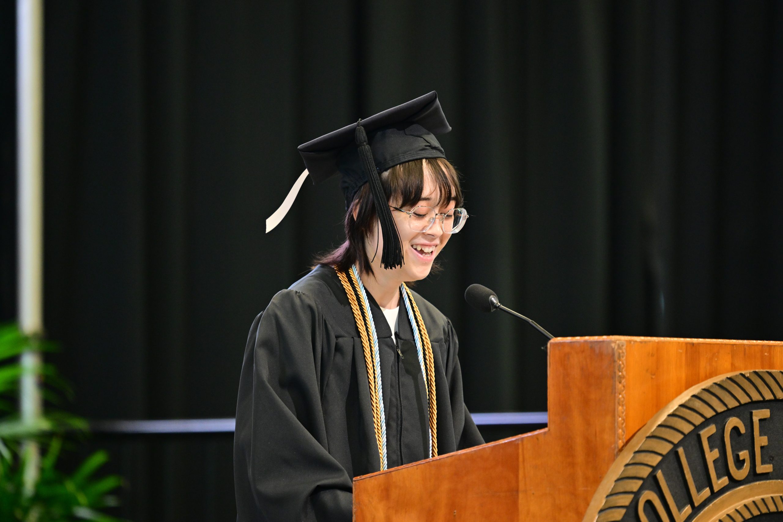 Physics major and senior speaker Karmellah Buttler ’25 added, “As lifelong learners and independent minds, working together, I hope that you will use your talents and brilliance to intentionally improve the lives of others around you.” Rayan Dos Passos ’25, majoring in global & international studies and Spanish, emphasized the others around him who helped him to grow. “Let yourself wonder about these stories, the friendships you built here, and remember how we held each other up, together,” Dos Passos said. “That as we walk away, we can always count on what we learned from each other because when life tests us, we will show up again, smiling, standing tall, and more important, sharing hope.”