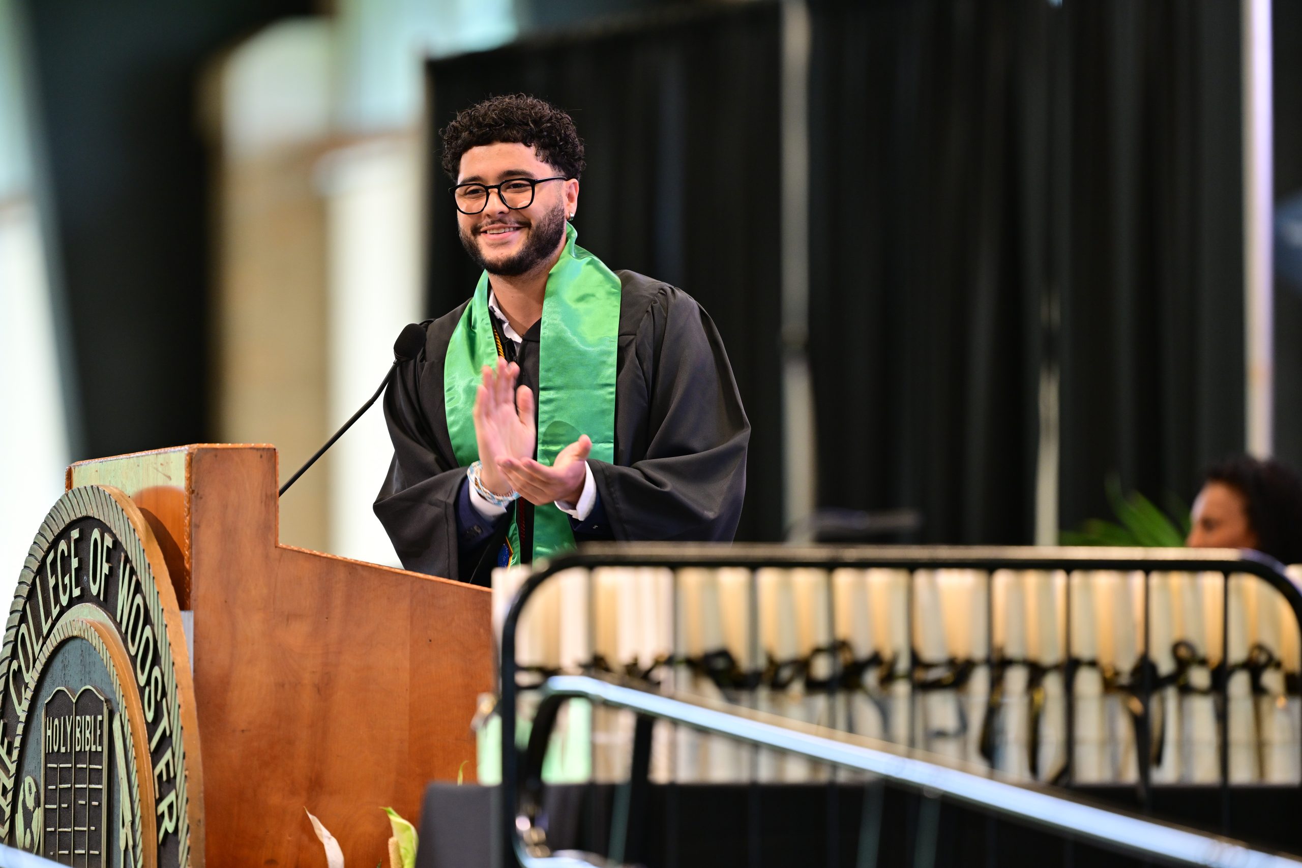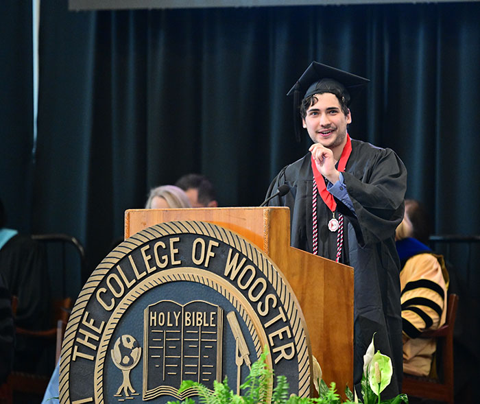 The theme of becoming comfortable with the uncomfortable, moving forward with purpose, and drawing from what they learned together emanated throughout the sentiments shared by speakers from this year’s senior class as well. Sam Peppers ’25, a political science major and religious studies minor, had the opportunity to share the invocation for his class this year and emboldened them to consider the tools that now arm them. “May we remember all the valuable lessons which Wooster has taught us, subtle and profound,” he said. “…that discourse and compromise do not undermine our values, and that critical thinking and knowledge themselves are virtues and the cure to the sickness of prejudice.”